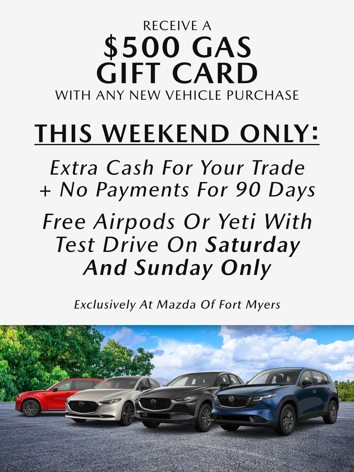 Long gone are the days of being pressured and haggled into purchasing a car just because you need one. Here at Mazda of Fort Myers, we gain an understanding of your needs in a vehicle by listening to your wants and must-haves, then we customize finance options to make sure you drive away completely satisfied. Contact us today to learn more about our used cars for sale in Fort Myers!